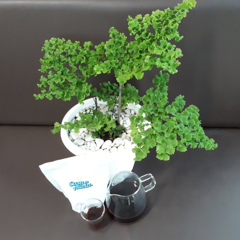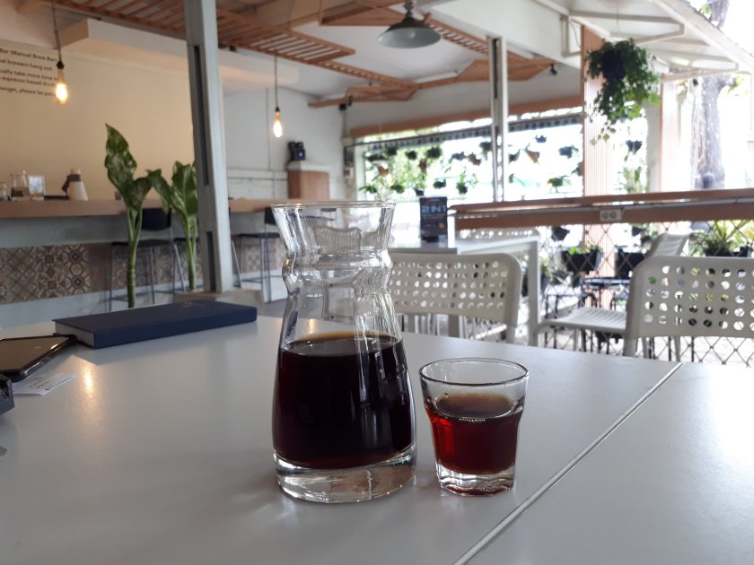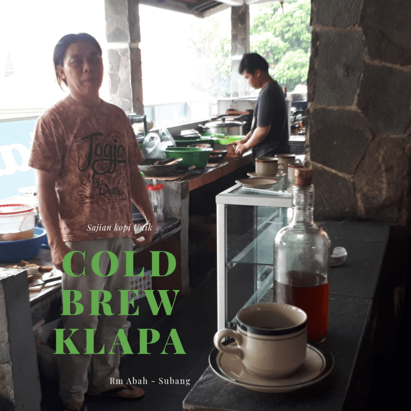 Ternyata…. standar pembuatan coldbrewnya sama, tapi yang menjadi pembeda adalah kualitas kemurnian air kelapa muda juga kesegarannya ditambah tempat pembuatan coldbrewnya sebuah wadah keramik putih yang menjadi ‘kameumeut‘ Pak Ade… beliau adalah pembuat cold brew kalapa ini… dan sekaligus penggiat dan pengrajin eh petani kopi yang menghasilkan kopi buhun hanjuang alam.