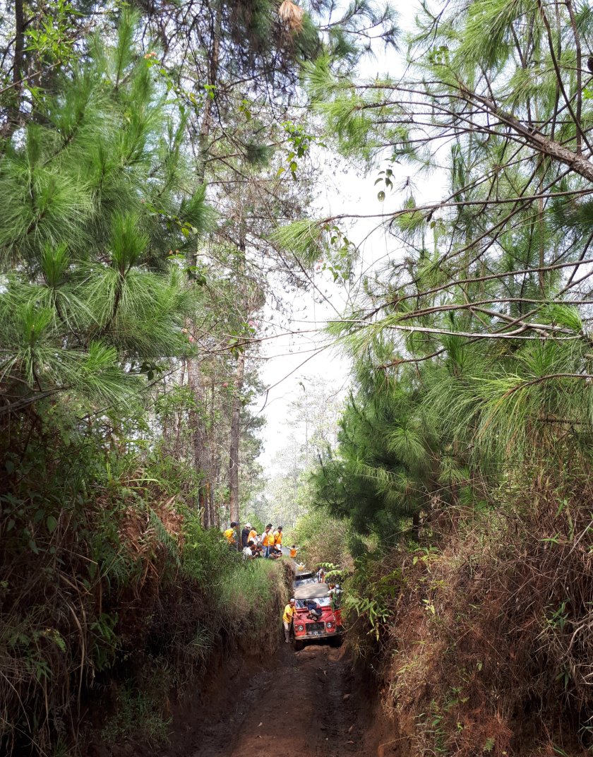 Yang pasti outbound kali ini bener-bener nyebrangin kebon eh kebun dan menembus hutan pinus serta kebun teh yang indah menghijau… tapi nggak jalan kaki karena akan menimbulkan kegemporan berjamaah, jadi digunakan media jeep landy yang membawa raga-raga haus refreshing ini menyusuri trek tanah berlumpur dan tebing sempit yang begitu menantang.