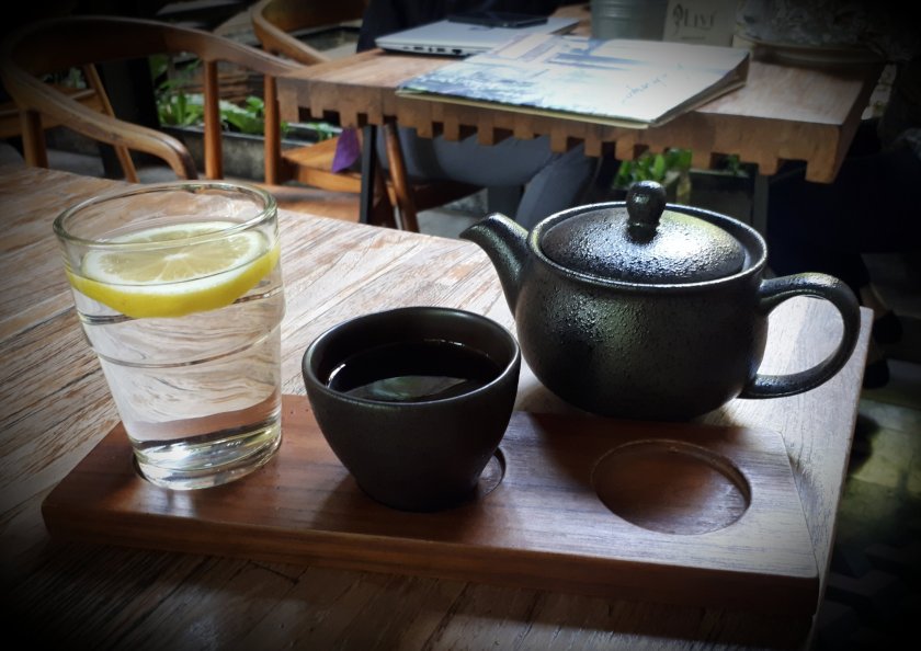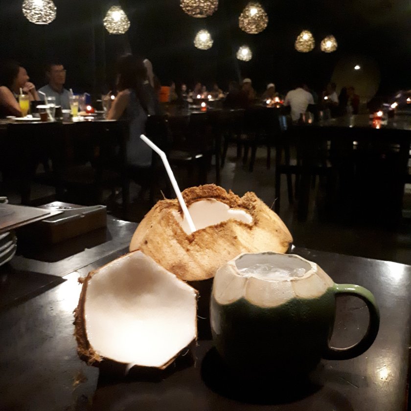 Karena judulnya rehat jadi tidak memilih makanan berat, cukup kudapan dan minuman yang cenderung sehat. Maka jatuhlah pilihan kepada sajian teh poci panas dan kelapa muda yang menjadi simbol dan nama restoran ini yaitu Kelapa manis.