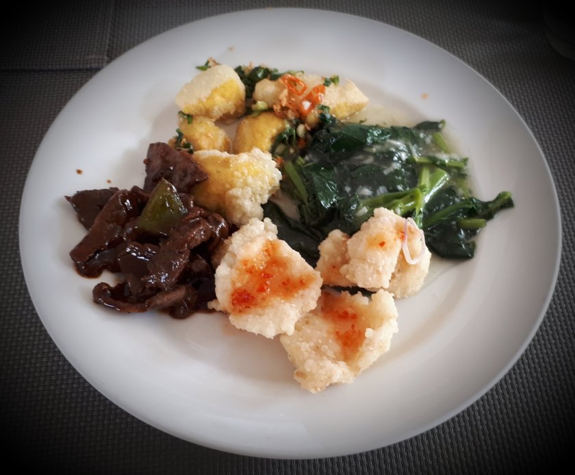 Giliran makan beratnya tentu saja sayuran dan goreng ikan yang menjadi pilihan. Tak lupa tahu goreng aci pedas dan sapi lada hitam menjadi pelengkapnya. Yang jadi pembeda, si potongan daging ikannya itu mirip cireng, penganan jajanan makanan ringan yang ngehits di Bandung. Pas dimakan… ya tetep ikan goreng, yaitu daging ikan dori.