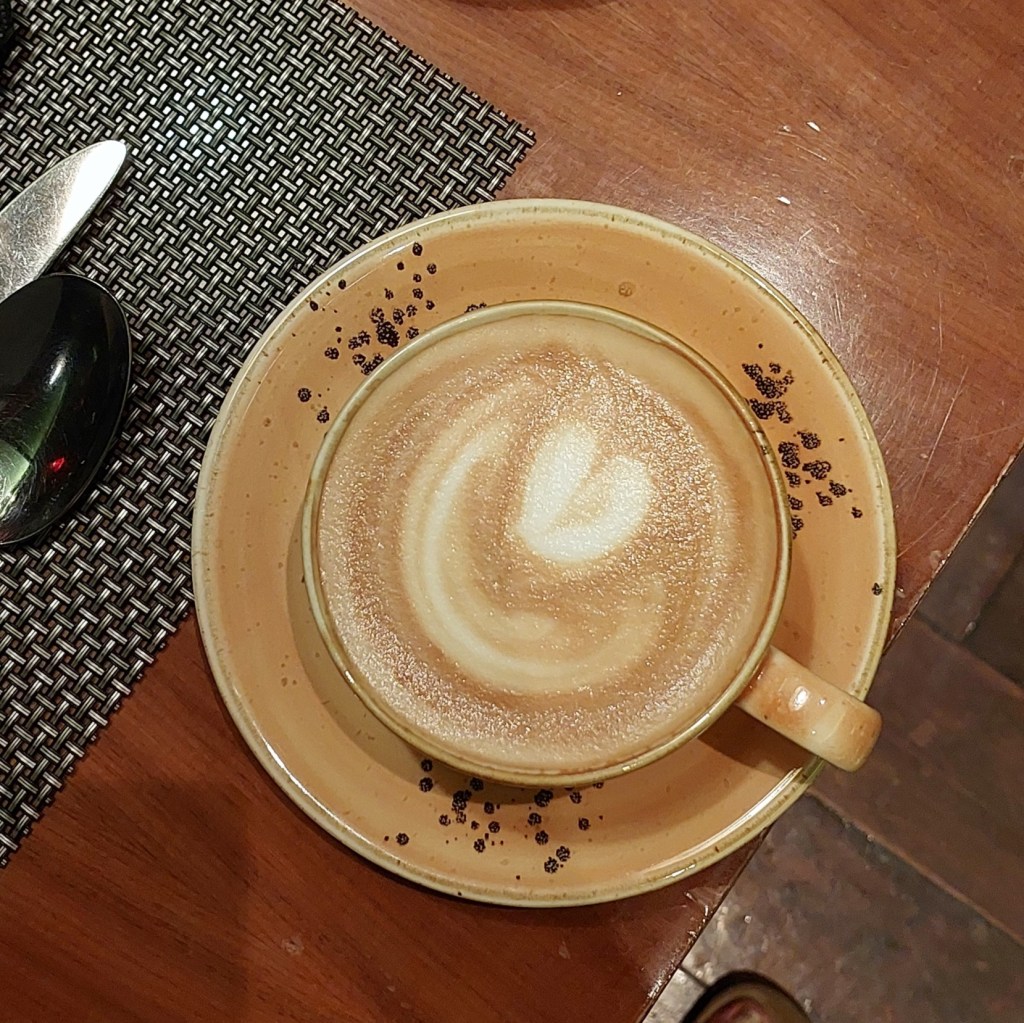 Nah setelah bolak balik dengan berbagai pilihan makanan yang ada dan dijejerkan di meja serta tidak lupa pesanan secangkir besar caffelate. Maka upacara makan pagi dimulai. Diawali sepotong sushi dan sashimi, dilanjutkan sepotong roti keju permesan dan satu slice pizza kecil dilengkapi sruputan perlahan caffelate, nikmat pisan.