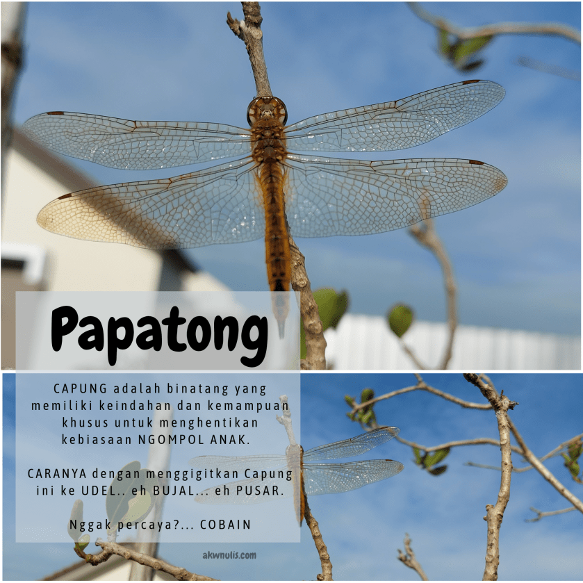 Namanya PAPATONG, itu nama dalam bahasa sunda. Bahasa indonesianya adalah CAPuNg atau versi LNnya DRAGONFLY. Binatang yang cantik, ringan dan lincah dengan sayap tipis warna perak keemasan. Kawan bermain masa kecil yang begitu menyenangkan.