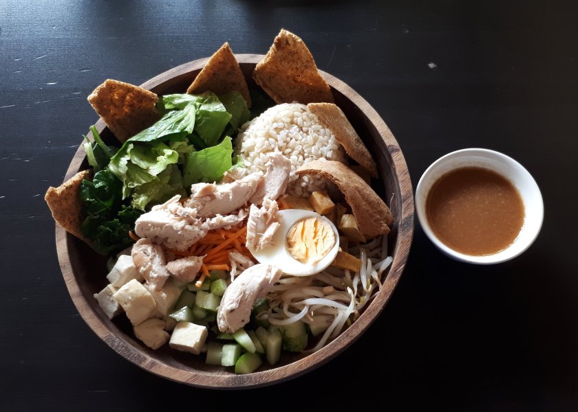 Pilihan makanannya adalah Nasi Hainan dan Vietnamese salad. Sementara sajian minumannya di-matchingkan dengan seragam korpri, maka teh biru yang menjadi pilihan, yaitu teh khas di resto ini yang menghasilkan warna biru, berasal dari bunga telang… nama resminya di sini adalah ‘Teh… halah lupa, ntar aku japri dulu.