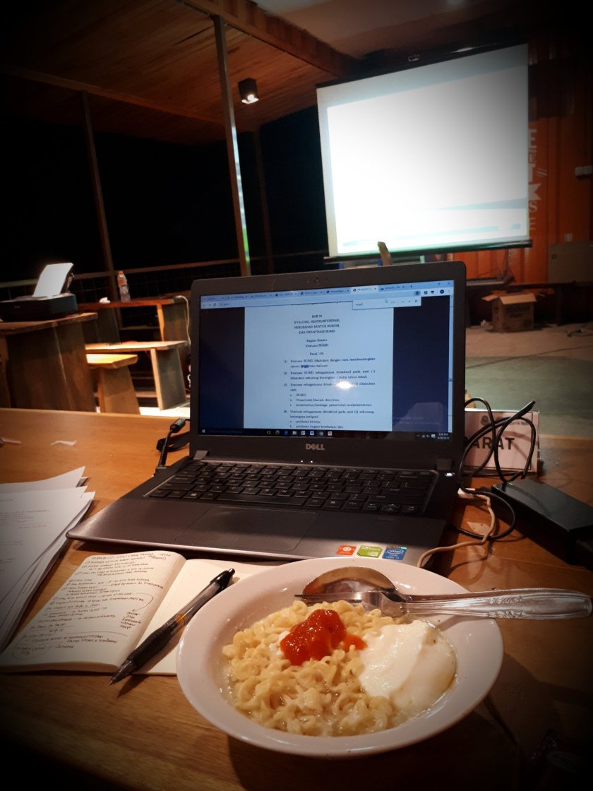 Kedua, Rapatnya di hutan, ruang rapat outdoor berbatasan langsung dengan sungai dan pepohonan besar yang begitu alami, menyegarkan tetapi semakin malam, terasa angin bertiup makin dingin dan kencang… awwww.