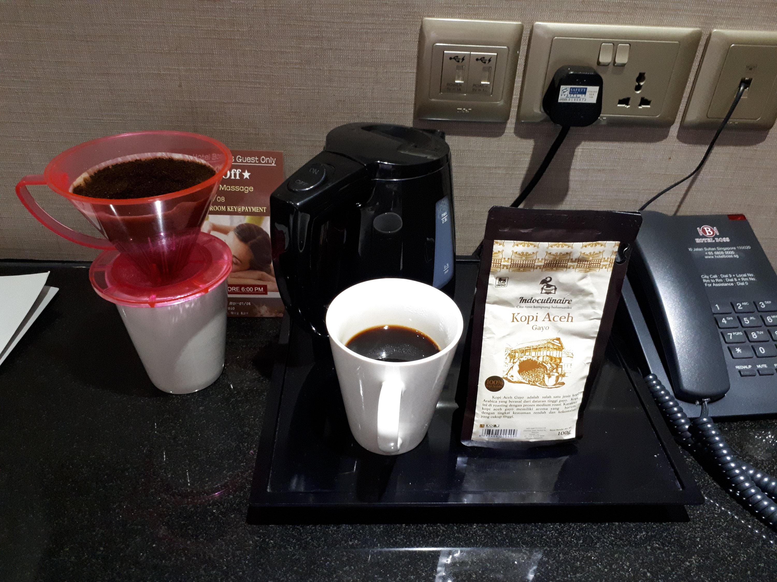 Setelah semua tuntas baru nyiapin ritual kopi yang membahagiakan. Sebungkus kopi gayo aceh yang dibawa dari Jatinangor tersenyum ceria setelah seharian berhimpitan dalam koper hitam kesayangan. Corong V60 pinky, kertas filter segera tersaji sementara untuk air panasnya sengaja membeli cadangan air destilasi 1500 ml seharga 2 dolar singapura khawatir yang dua botol kecil fasilitas hotel nggak mencukupi.
