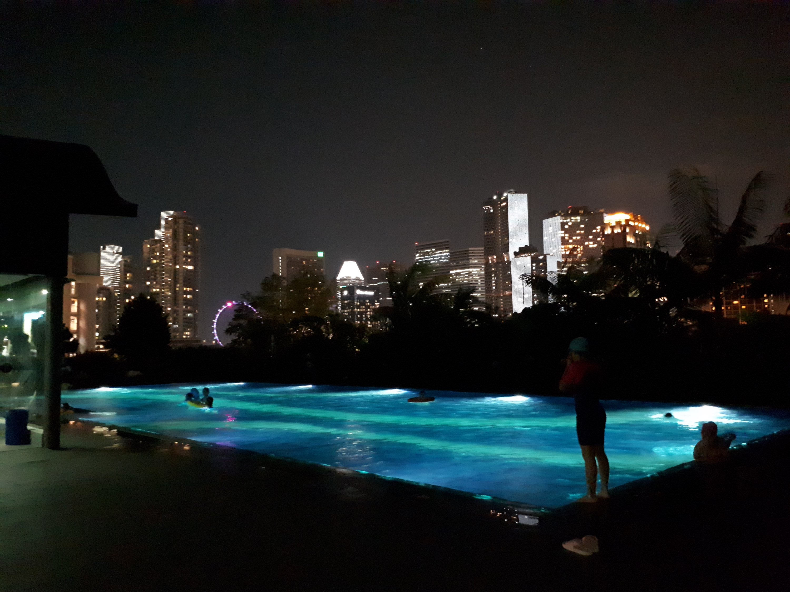Sebelum tiba di kamar, nyempetin dulu survey kolam renang fasilitas hotel yang berada di lantai 4…… keluar lift ambil arah kanan dan kiri sama saja bisa aksee ke kolam renang dan ruang terbuka serta area merokok yang bebas… (maklum di singapur khan nggak boleh merokok sembarangan)… air kolam renang membiru mengajak segera bergabung bercengkerama dalam gerahnya malam…