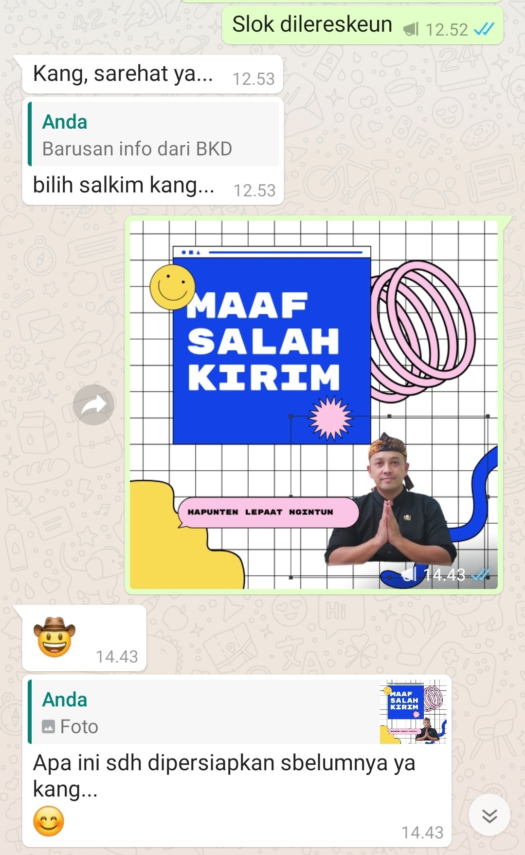 Singkat cerita, sebuah permohonan maaf dengan DM satu persatu belum tentu tepat sasaran. Maka segera buat gambar berisi kata maaf dan ucapan salah kirim dilengkapi photo diri yang senada. Lalu di broadcast all ke semua kontak yang tadi terlanjur ‘terganggu’ dengan kirimanku.
