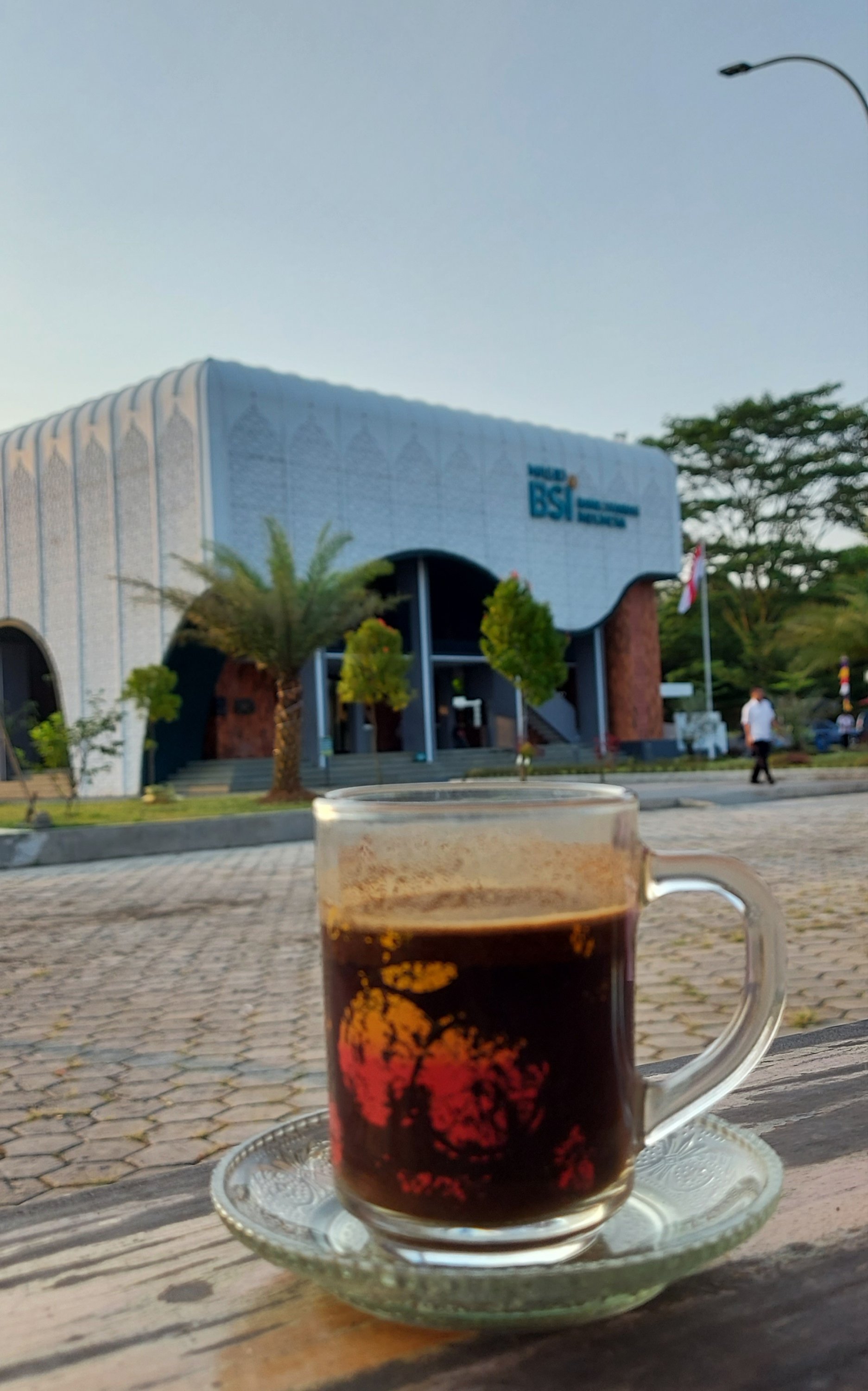 Maka sebagai sebuah kenangan, segelas kopi berlatar belakang mentari sore serta mesjid BSI menjadi catatan penting dalam menyore kali ini.