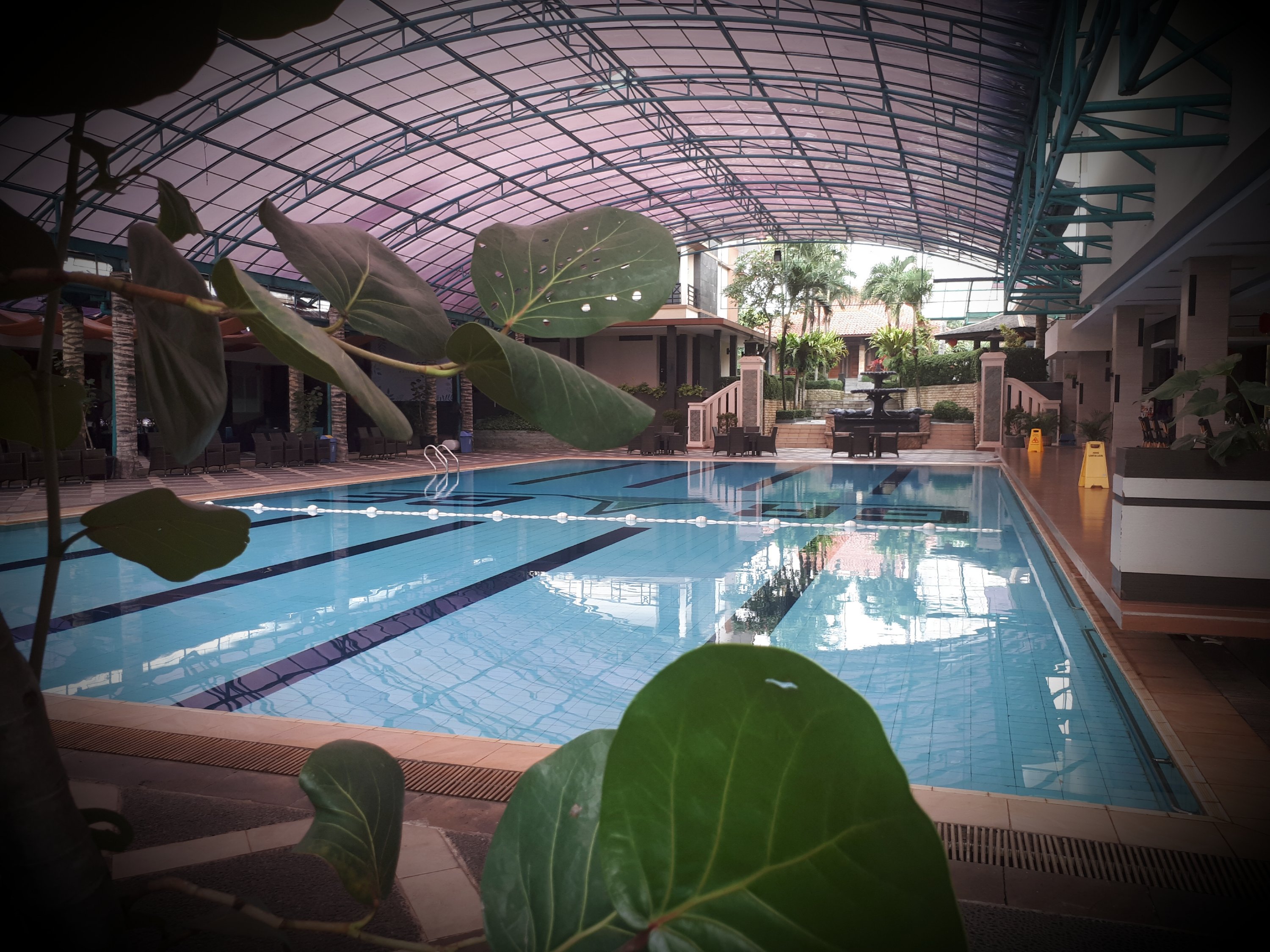 Dengan berat hati dan mengendalikan gejolak keinginrenanganku ini, maka hanya bisa memotret suasana kolam renang dan siluet tetesan air hujan di beningnya kaca. Raga mundur perlahan dan berbelok arah menuju coffeeshop saja. Mencari seruput kopi yang mungkin bisa menenangkan gejolak ini dan kembali berdamai dengan keadaan dan menyusun ulang rencana tindak ke depan.